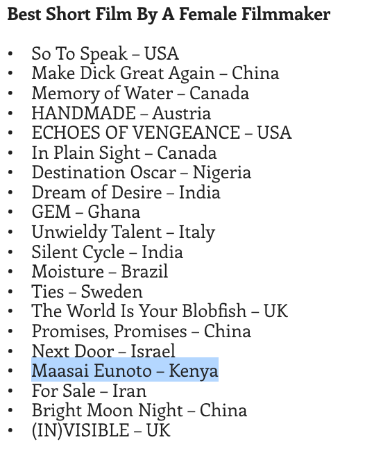 We’re honored to announce that Maasai Eunoto has been awarded as Finalist for Best Short Film by a Female Filmmaker as well as Finalist for Best Indigenous Documentary (Local Language) at the globally recognized Toronto International Nollywood Film Festival, which will be held on September 6th-13th, 2025, in Toronto Canada.